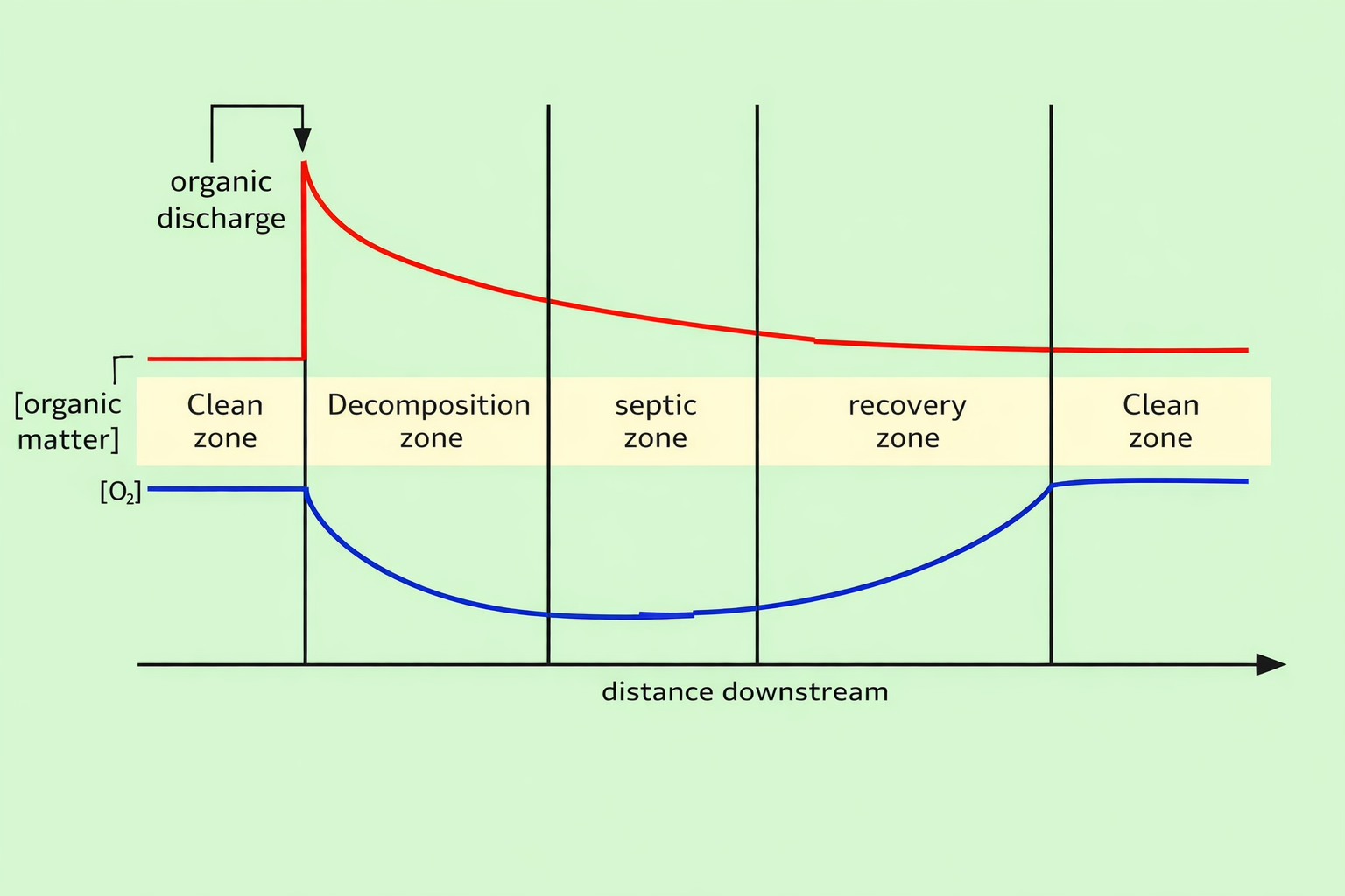 • Final clean zone: The dissolved oxygen level returns to high