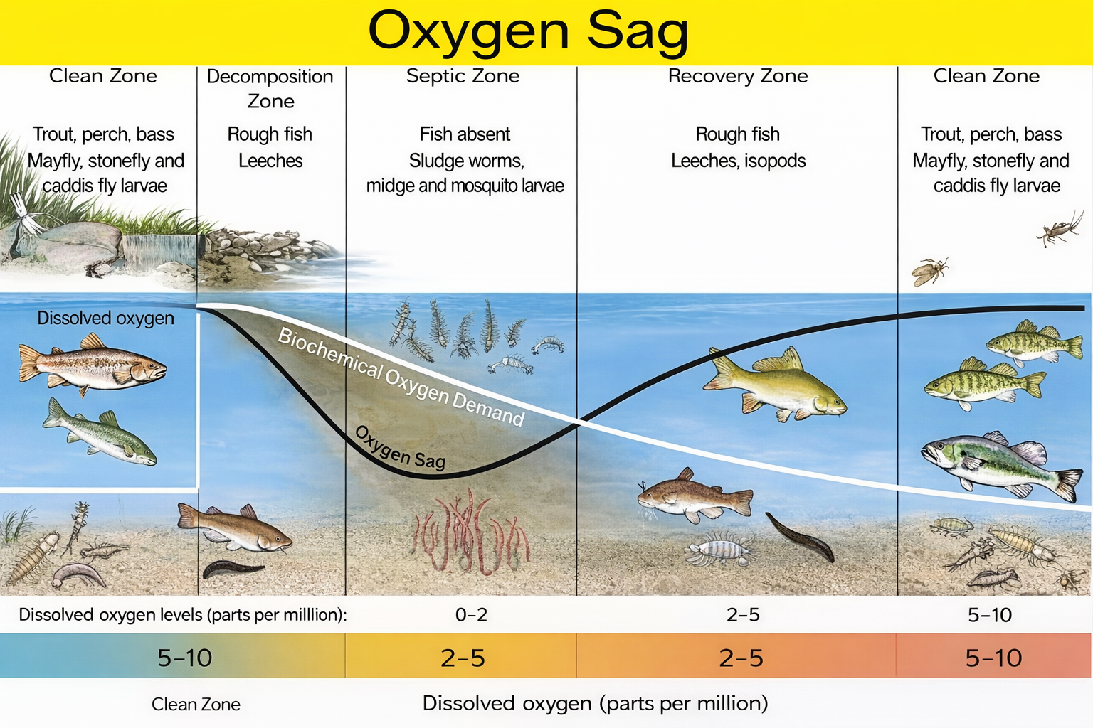 The oxygen sag curve shows different zones as the water flows from the pollution source, including: