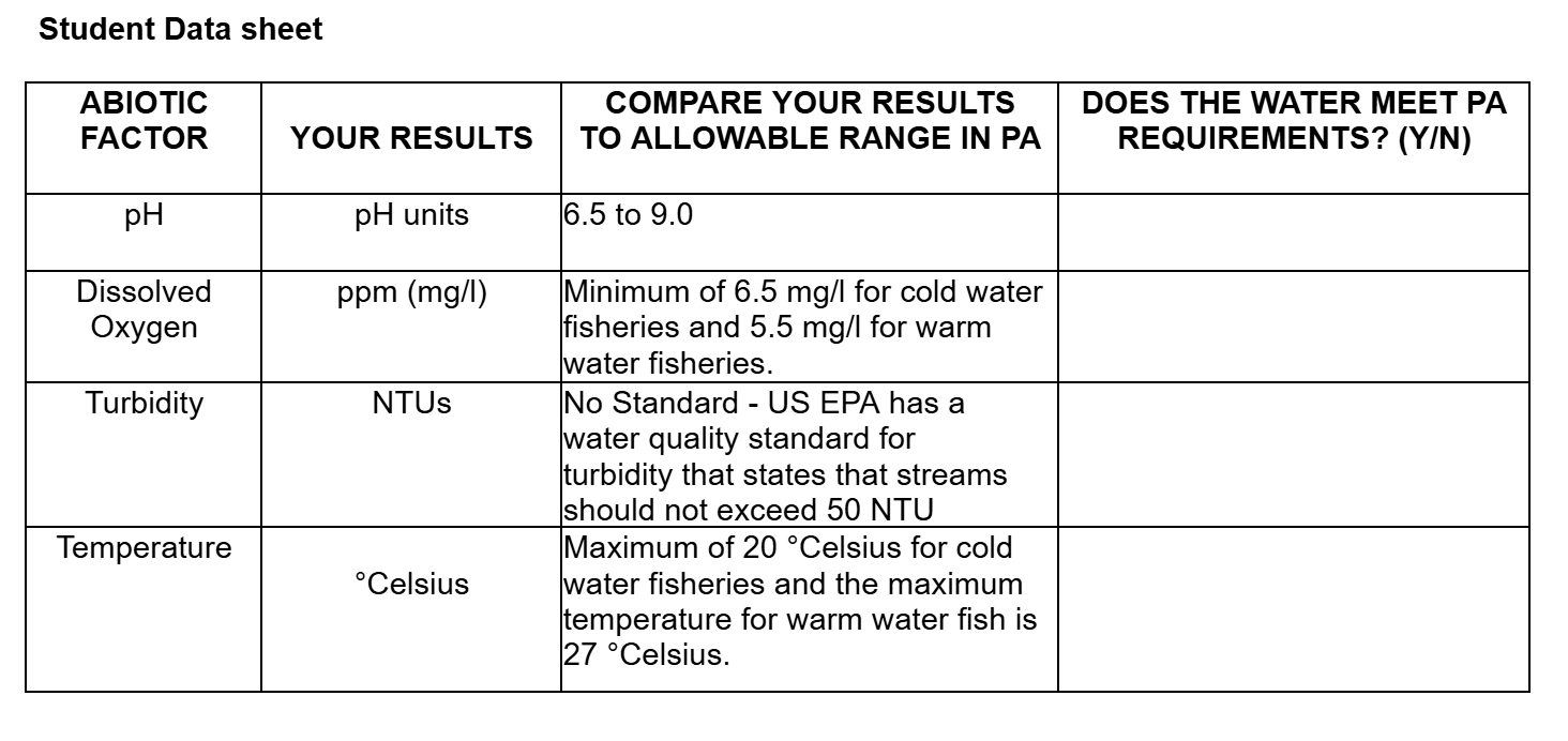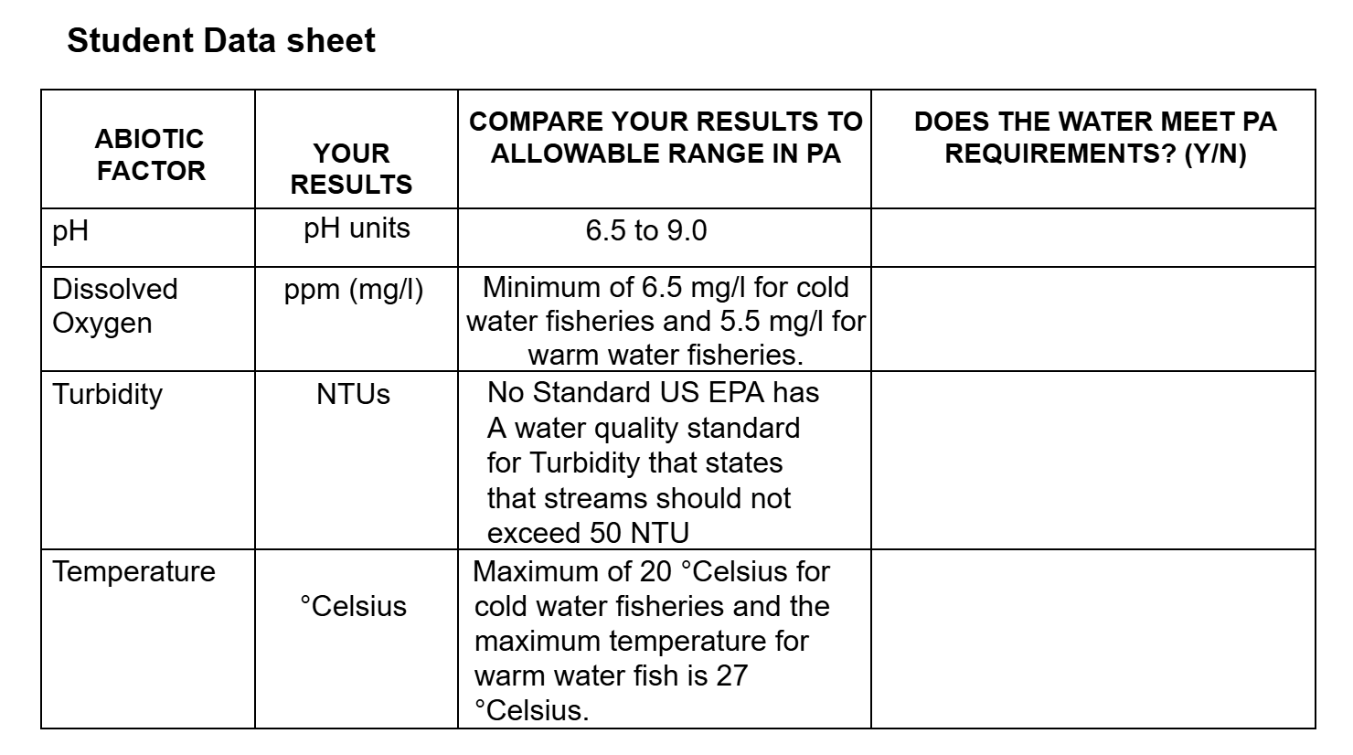 In this activity students will observe and list abiotic factors in an aquatic system and measure four of them (pH, dissolved oxygen, turbidity, and temperature).