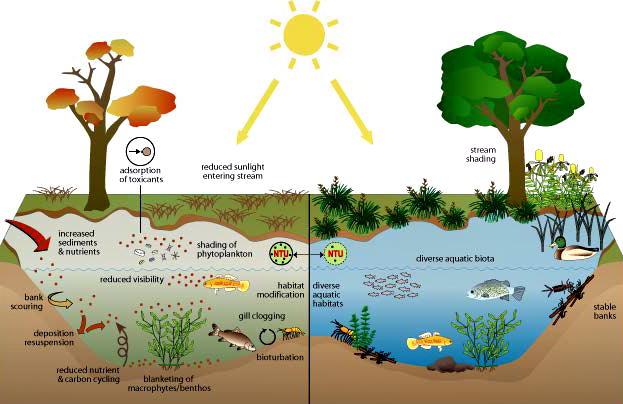 Reduced sunlight: Turbidity blocks sunlight from reaching plants, which reduces their ability to photosynthesize and produce oxygen. This reduces the amount of oxygen available to aquatic life.