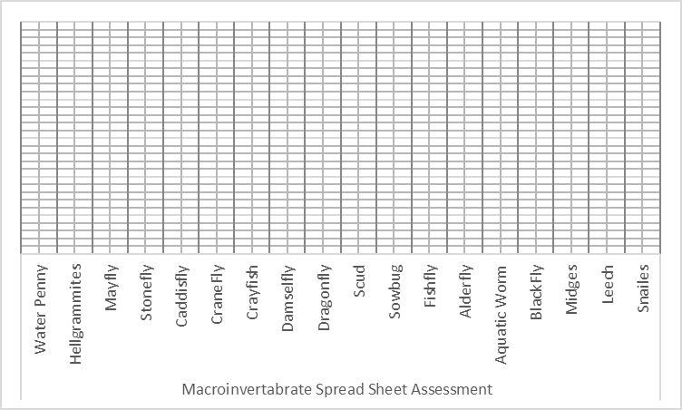 - Distribute graph paper to each student. Have students set up a bar graph for the aquatic macroinvertebrate sample. Label the x-axis with the names of the macroinvertebrates. Label the y-axis with the number of macroinvertebrates. You can also make copies of the graph below to hand out to the students.