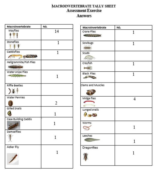 - Using the Macroinvertebrate Talley Sheet Have the students count the number of each species of macroinvertebrate and graph them on the paper. Have the students try to determine the quality of the water.
