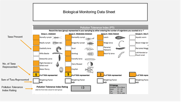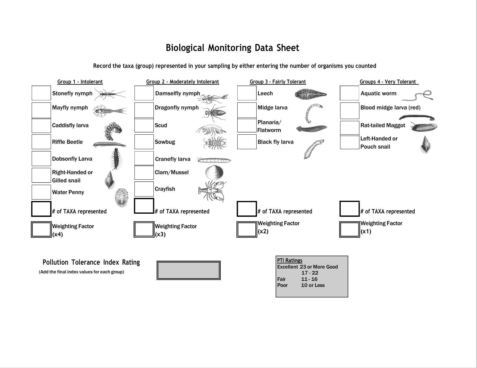 Use the Biological Monitoring Data Assessment Sheet to record the presence and abundance of macroinvertebrate to assess the overall water quality.